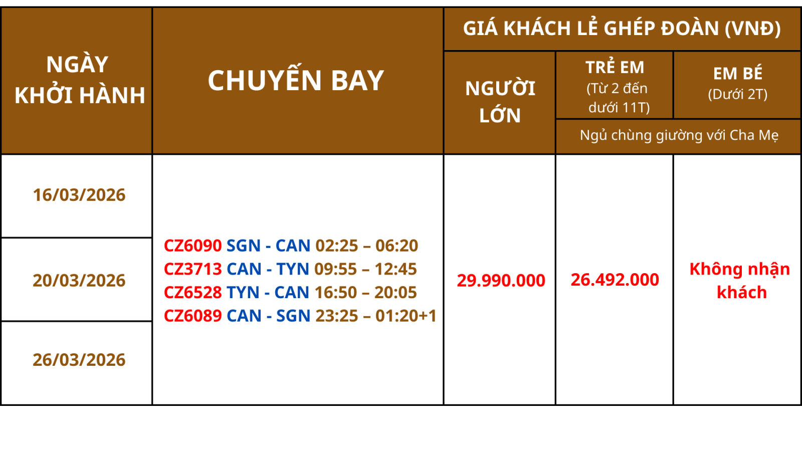 Quý khách ăn trưa tại nhà hàng địa phương, sau đó di chuyển ra sân bay, đoàn làm thủ tục đáp chuyến bay nội địa về Quảng Châu trên chuyến bay CZ6528 TYN – CAN 16:50 – 20:05. Sau đó nối chuyến và làm thủ tục xuất cảnh về Tp. Hồ Chí Minh trên chuyến bay CZ6089 CANSGN 23:25 – 01:20+1 (ăn tối trên máy bay).